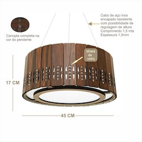 Lustre Decorativo Madeira Pendente Redondo Arpoador 45cm Cor: Pau Ferro A iluminação certa pode transformar um ambiente, deixando-o mais requintado, confortável e aconchegante. Nossas luminárias são criadas e desenvolvidas com a intenção fazer essa transformação, pois são construídas com material de primeira e com projetos muito bem elaborados, unindo beleza, funcionalidade e bom gosto. Conseguimos com elas, fazer o casamento do acrílico, alumínio e madeira de maneira harmônica. ------------------------------------------------------------------------------------- ESPECIFICAÇÕES TÉCNICAS ------------------------------------------------------------------------------------- DIMENSÕES: Comprimento: 45 cm Largura: 45 cm Altura: 17 cm Peso: 2,50 kg Qtde de lâmpadas: 3 led 6 a 15 W Alimentação: Bivolt 110/220