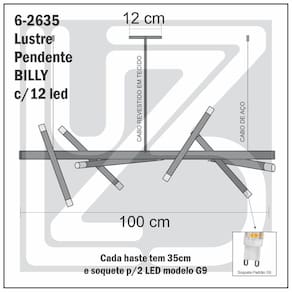 LUSTRE BILLY---------------------------- Modelo: Lustre Grande Articulado Slim Palito Moderno Billy- Acabamento: Pintura a pó térmica- Tamanho das hastes articuladas: 30cm- Quantidade de hastes: 6 --- CADA HASTE COM 2 SOQUETES ---- Material: Hastes em Alumínio- Tamanho Aproximado: Haste centarl com 98cm- Cabo: Cabo Revestido em Tecido - 70cm- Soquete: Padrão G9- Bivolt: Sim---------------------------------------------------------------------------------------------------------O lustre pendente "Billy" é caracterizado por sua aparência elegante e minimalista. É um modelo que combina perfeitamente com ambientes contemporâneos e oferece uma iluminação brilhante e sofisticada. As principais características do lustre pendente Billy são: - Design fino e estilizado: O lustre apresenta um formato esbelto e linear, com linhas suaves e elegantes que adicionam um toque moderno ao ambiente.- Material de alta qualidade: O lustre é fabricado todo em alumínio, material muito leve e resistente, garantindo durabilidade.- Iluminação brilhante: Com 12 lâmpadas G9, o lustre Billy proporciona uma iluminação ampla e intensa, garantindo uma atmosfera luminosa e agradável no espaço onde é instalado. Com uso de lampadas LED se adequa às suas necessidades de iluminação e eficiência energética.- Regulagem de altura: O lustre Billy possuem a opção de ajuste de altura, permitindo que você adapte o comprimento do cabo de suspensão para adequar-se à altura do teto e às suas preferências de design. Tem como padrão 70cm de cabo, caso necessite maior basta solicitar na hora da compra.