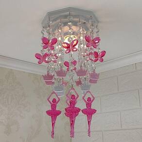 R: Os pingentes desse lustre são bailarinas, borboletas e coroas, feitos em acrílico nas cores rosa e branca.