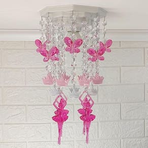 O destaque desse lustre está nos detalhes dos pingentes. As bailarinas, borboletas e coroas, feitas em acrílico nas cores rosa e branca, dão um toque especial e divertido ao lustre. Além disso, as castanhas de acrílico transparente e cor rosa também contribuem para a beleza desse produto.