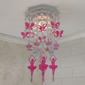 R: Os pingentes desse lustre são bailarinas, borboletas e coroas, feitos em acrílico nas cores rosa e branca.