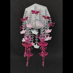 R: Os detalhes do lustre incluem castanhas de acrílico transparente e cor rosa, borboletas cor de rosa, bailarinas cor de rosa e coroas cor de rosa e branca.