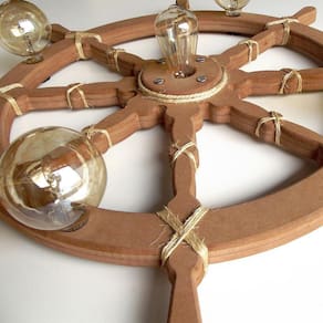 Lustre luminária pendente 85cm leme de navio rústico 5b Lindo para decorar em cima de uma mesa de jantar, hall de entrada área de churrasco, ambientes como áreas de garagem, garagens com bar, chácara, decorar festas, lanchonetes, casa de campo, pousadas entre outras. Deixando seu ambiente ainda mais agradável. Garantimos a qualidade de nossos produtos Nossos produtos são de fabricação própria cortadas com cnc router que nos traz medidas e ângulos perfeitos nosso acabamento é feito à mão, são envernizados com verniz de alta resistência e durabilidade dando assim um ótimo acabamento. Características da luminária: - dimensões: - diâmetro 85 cm - peso do produto 5 kg - espessura 3 cm - bocais 5- material: mdf medium density fiberboard - mdf ecologicamente correto com certificado fsc de alta qualidade - cor: mogno - nível de instalação: fácil - garantia de 12 meses contra defeitos de fabricação Conteúdo da embalagem: - ganchos sim- soquetes sim- base para teto sim - corda sim- fios sim- lâmpadas não Os objetos decorativos não acompanham o produtoA voltagem depende da lâmpada 100/220 vAs lâmpadas não acompanham o produto Marca: Eco.Start