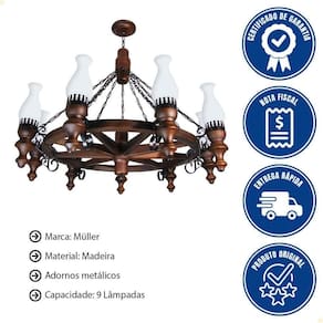 Lustre Muller Roda Carroça 9 Lâmpadas Envelhecido 909e - Transforme seu ambiente com o charme rústico do Lustre Roda Carroça 9LP Envelhecido 909E da Muller. - Com design exclusivo inspirado em rodas de carroça, ele traz personalidade e aconchego para qualquer espaço. - Produzido em madeira de reflorestamento, une sustentabilidade e sofisticação perfeito para quem valoriza estilo com consciência. - Garanta já o seu e impressione com uma iluminação que conta história! LUSTRE RODA CARROÇA 9LP ENVELHECIDO 909E Marca: Muller Modelo: Carroça 909E