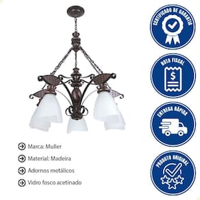 O Lustre Muller Rústico 505E possui garantia de 3 meses contra defeitos de fabricação. Peso Líquido: 0.0000 | Dias Entrega Fornecedor: 1 | EmbalagemComprimento-cm: 66 | Cubagem: 0.181764 | EmbalagemAltura-cm: 40.5 | EmbalagemLargura-cm: 68 | Marca: Luminárias Muller | Modelo: Rustica Marca: Não Informado Ean: 7897139816571