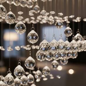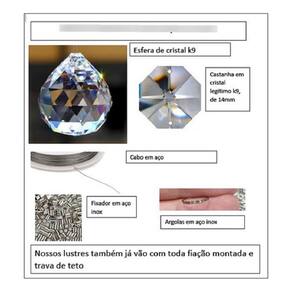 Brilho Intenso: O lustre conta com 64 pêndulos, que incluem 64 esferas de 30 mm e aproximadamente 350 castanhas de 14 mm de cristal K9 legítimo.