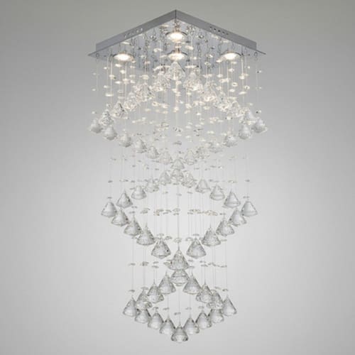 Adicione um toque de luxo e modernidade ao seu ambiente com este deslumbrante lustre pendente. O design quadrado, a base espelhada de aço inox e a cascata de cristais super brilhantes se unem para criar um espetáculo de luz e reflexos. Esta peça é perfeita para transformar qualquer espaço que busca uma iluminação sofisticada.