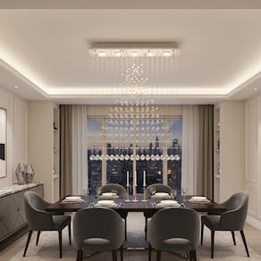 Este lustre pendente é a escolha ideal para quem busca adicionar um toque de luxo e sofisticação a qualquer ambiente. Com sua base retangular de 18x70 cm em aço inoxidável espelhado, ele cria um efeito visual deslumbrante, refletindo a luz dos cristais de forma magnífica.
