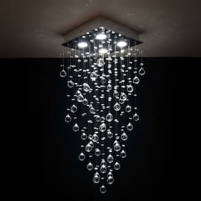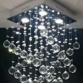 Este é um pendente de teto moderno e elegante, perfeito para adicionar um toque de sofisticação a qualquer ambiente. Com sua base quadrada de 30x30 cm em aço inoxidável espelhado, ele reflete a luz e o brilho dos cristais, criando um efeito deslumbrante.