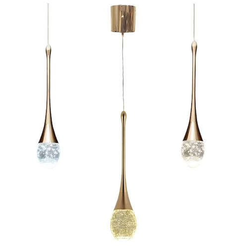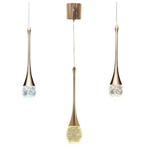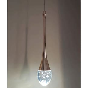 O pendente possui um formato gracioso de gota e é feito de cristal, que oferece brilho e reflexos deslumbrantes quando a luz é acesa. As bolhas presentes no cristal adicionam um charme extra, criando um jogo de luz e sombra único.
