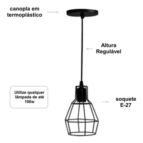 CARACTERÍSTICASLustre para uso interno ou área coberta: cozinha, balcão, varanda, sala de estar, sala de jantar, suíte, quartos, corredor, hall, mezanino, escadas, área de circulação, lojas, comércios.Cabo: 1 metro regulável.Material: termoplástico, soquete E-27.*não acompanha lâmpada.