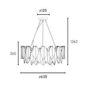 Especificações gerais do produto:Voltagem: BivoltDimensões AxLxP (mm): 265x630x630Material: Aço e VidroGarantia: 1 ano junto ao fabricanteReferência: 86301130 (Dourado)Lâmpada Inclusa: NãoLocal de Uso: InternoNúmero de Lâmpadas: 8Potência Máxima (por soquete): 40WSoquete: E14Grau de Proteção: IP 20Frequência: 50/60 HzLâmpada Indicada: Vela O que acompanha o produto:-1 Lustre Pendente