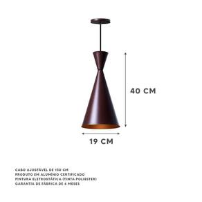 Deixe sua casa muito mais moderna e sofisticada com o Lustre Pendente Canadá Da Ideallume. Produzido em alumínio, o produto não enferruja. O Lustre é ideal para ser utilizado em áreas externas e internas. Com esse produto você dará um toque de beleza que valoriza sua casa. Especificações Técnicas: Marca: Ideallume Modelo: Canadá Produto: Lustre Cor: Marrom E Cobre Dimensões: 40 X 19 cm Canopla: redonda de 11cm de diâmetro Material: Alumínio Fio: Ajustável de 150cm Soquete: E-27 utilize a lâmpada que desejar : de 6 meses contra defeitos de fabricação IMPORTANTE: Lâmpadas não inclusas neste produto. Conteúdo Da Embalagem: 1x Lustre Pendente Canadá Marrom E Cobre Mesa Jantar Balcão Marca: Não Informado