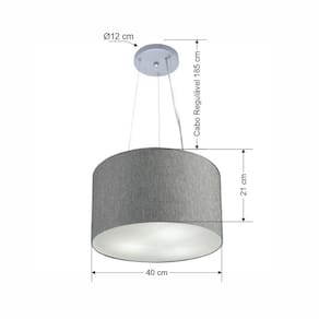 Pendente Moderno Indicado para decoração área interna, como mesas, sala de estar, sala de jantar, suíte, quartos, corredor, hall, mezanino, escadas, churrasqueira, lareira, área de circulação, lojas, comércios, restaurante, varanda, balcão.DimensãoCúpula em Tecido: 40x21cm