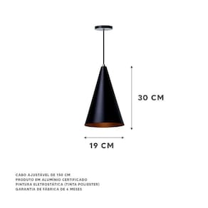 Deixe sua casa muito mais moderna e sofisticada com o Lustre Pendente Cone Da Ideallume. Produzido em alumínio, o produto não enferruja. O Lustre é ideal para ser utilizado em áreas externas e internas. Com esse produto você dará um toque de beleza que valoriza sua casa. Especificações Técnicas: Marca: Ideallume Modelo: Cone Produto: Pendente Tamanho: M Cor: Preto Dimensões: 30 x 19cm Canopla: redonda de 11cm de diâmetro Material: Alumínio Fio: Ajustável de 150cm Soquete: E-27 utilize a lâmpada que desejar Garantia: Garantia de 6 meses contra defeitos de fabricação Quantidade: 2 Lustres/Pendentes IMPORTANTE: Lâmpadas não inclusas neste produto. Conteúdo Da Embalagem: 2x Lustre Pendente Cone M Preto Alumínio Decoração