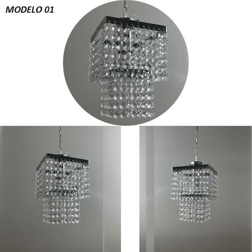 especificações técnicas: Base: quadrada em metal cromado com 2 camadas Altura total: 27 cm + 25 cm de corrente ajustável = até 52 cm pode ser instalado diretamente no teto, sem a corrente Castanha: modelo 804 - cristal acrílico de alto brilho 14 mm Lâmpada: 1x soquete e-27 bivolt - compatível com led, comum ou econômica Peso aproximado: 1,0 kg Voltagem: bivolt 110v ou 220v Instalação: produto enviado montado e pronto para instalar