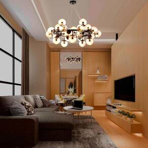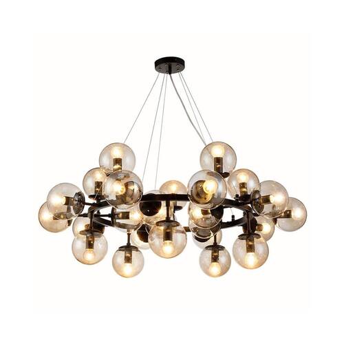 Descrição Material: estrutura em Metal e Cúpula de Vidro Cor:estrutura preta e Cúpulas Champagne Quantidade de lâmpadas: 25 lâmpadas Não inclusas Bocal: e-27 em LED Medidas: 40 x 100 cm Altura x Diâmetro Marca: Não Informado