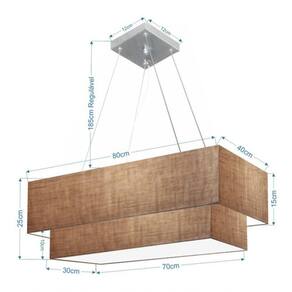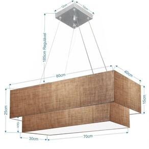O Lustre Pendente Duplo Retangular Vivare Brasil Iluminação Md-4321 é ideal para iluminar e valorizar ambientes internos com elegância. Com cúpulas em tecido retangulares grandes e design em formato retangular, oferece iluminação eficiente e visual moderno. O fio e cabo ajustável de até 185cm permite regular a altura conforme a necessidade do espaço. É indicado para uso em salas de jantar, estar, áreas gourmet e outros ambientes residenciais ou comerciais. A marca Vivare Brasil Iluminação oferece garantia de 12 meses para o produto.