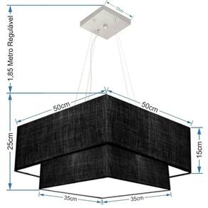 Pendente quadrado apresenta facilidade na instalação e manutenção e limpeza, além de possibilitar o ajuste da altura de acordo com suas necessidades. O que oferecem um charme único aos espaços e estão cada vez mais presentes na decoração.DimensãoCúpula em Tecido: 25x50x35cm