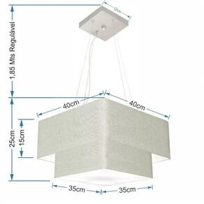 Pendente quadrado apresenta facilidade na instalação e manutenção e limpeza, além de possibilitar o ajuste da altura de acordo com suas necessidades. O que oferecem um charme único aos espaços e estão cada vez mais presentes na decoração.DimensãoCúpula em Tecido: 25x40x35cm