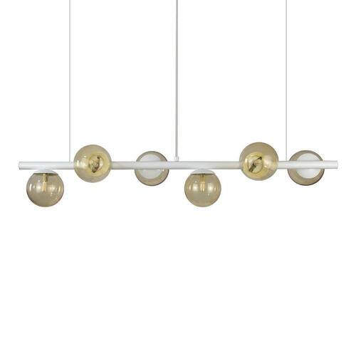 Lustre Pendente Branco - 6 Globos Esfera De Vidro Ambar A linha de luminárias modelo tem um ar contemporâneo, um estilo moderno, minimalista e ao mesmo tempo uma sensação retrô. Os pendentes podem ser colocadas em quartos, salas de jantar ou estar e as arandelas indicamos para lounges, salas, dormitórios ou até mesmo em lavabos. Com Design simples trazem classe e estilo a qualquer ambiente. Todos luminárias da linha são produzidas em alumínio com esferas de vidro. Descrição Técnica: - Modelo: Lustre Pendente com 6 Globos de Vidro - Acabamento: Pintura a pó térmica - Tamanho dos Globos de Vidro: 120mm - Quantidade de Globos de Vidro e soquetes: 6 - Material: Globo em Vidro e Hastes em Alumínio - Tamanho Aproximado (LxAxP) com os Globos de Vidro: 100 cm X 20 cm X 20 cm - Cabo: Cabo Revestido em Tecido - 70cm - Soquete: Padrão G9 - Bivolt: Sim ****