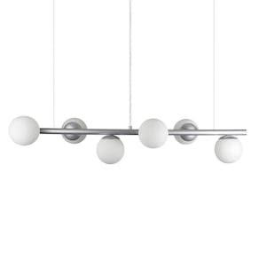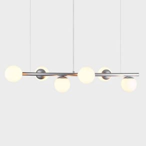 Lustre Pendente Prata - 6 Globos Esfera De Vidro Branco A linha de luminárias modelo tem um ar contemporâneo, um estilo moderno, minimalista e ao mesmo tempo uma sensação retrô. Os pendentes podem ser colocadas em quartos, salas de jantar ou estar e as arandelas indicamos para lounges, salas, dormitórios ou até mesmo em lavabos. Com Design simples trazem classe e estilo a qualquer ambiente. Todos luminárias da linha são produzidas em alumínio com esferas de vidro. Descrição Técnica: - Modelo: Lustre Pendente com 6 Globos de Vidro - Acabamento: Pintura a pó térmica - Tamanho dos Globos de Vidro: 120mm - Quantidade de Globos de Vidro e soquetes: 6 - Material: Globo em Vidro e Hastes em Alumínio - Tamanho Aproximado (LxAxP) com os Globos de Vidro: 100 cm X 20 cm X 20 cm - Cabo: Cabo Revestido em Tecido - 70cm - Soquete: Padrão G9 - Bivolt: Sim ****