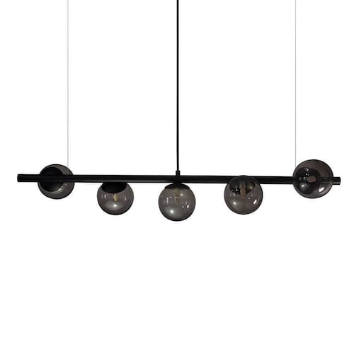 Lustre Pendente Preto - 5 Globos Esfera De Vidro Fumê A linha de luminárias modelo tem um ar contemporâneo, um estilo moderno, minimalista e ao mesmo tempo uma sensação retrô. Os pendentes podem ser colocadas em quartos, salas de jantar ou estar e as arandelas indicamos para lounges, salas, dormitórios ou até mesmo em lavabos. Com Design simples trazem classe e estilo a qualquer ambiente. Todos luminárias da linha são produzidas em alumínio com esferas de vidro. Descrição Técnica: - Modelo: Lustre Pendente com 5 Globos de Vidro - Acabamento: Pintura a pó térmica - Tamanho dos Globos de Vidro: 120mm - Quantidade de Globos de Vidro e soquetes: 5 - Material: Globo em Vidro e Hastes em Alumínio - Tamanho Aproximado (LxAxP) com os Globos de Vidro: 100 cm X 20 cm X 20 cm - Cabo: Cabo Revestido em Tecido - 70cm - Soquete: Padrão G9 - Bivolt: Sim ****