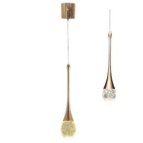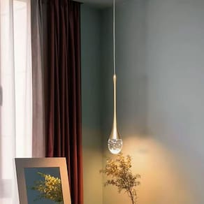 O pendente possui um formato gracioso de gota e é feito de cristal, que oferece brilho e reflexos deslumbrantes quando a luz é acesa. As bolhas presentes no cristal adicionam um charme extra, criando um jogo de luz e sombra único.