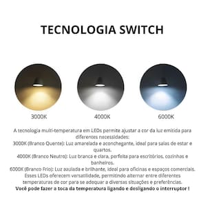 Ajuste de intensidade e temperatura de cor Escolha a intensidade e a cor da luz que se adapta ao seu ambiente, desde um tom mais quente para momentos de relaxamento até uma luz mais fria para maior foco e produtividade. É possível escolher entre as cores branco neutro, branco quente e branco frio, através de um simples toque no interruptor, a cada toque uma cor tecnologia switch