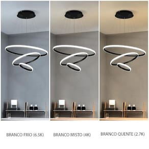 O lustre possui três temperaturas de cor: Branco Frio, Misto e Branco Quente. Para fazer a mudança das temperaturas de cor basta desligar e ligar o interruptor do seu próprio ambiente.