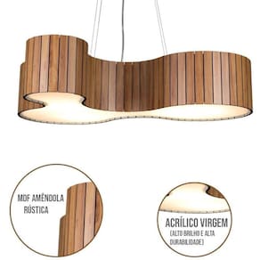 Produzido com um acabamento em madeira Amêndola Rústica, este lustre possibilita a combinação com diversos estilos de decoração, desde os mais rústicos até os mais modernos. Feito de MDF amadeirado de alto padrão, acrílico, acessórios para sustentação, soquetes e fiação elétrica, este produto é sinônimo de durabilidade e resistência.