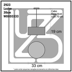 Descrição Técnica: - Modelo: Wood 33 - Acabamento: Madeira Natural - Quantidade de soquetes: 2 - Material: Madeira e Acrílico Cast - Tamanho (LxAxP): 33x20x33 cm - Cabo: 70 cm (regulável) - Soquete: Padrão E27 - Bivolt: Sim - Canopla: Em metal 12 cm OBS. Como são fabricados em madeira, podem apresentar diferenças em tonalidade conforme o lote da matéria prima.