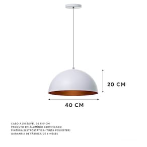 Com dimensões de 20x40cm, o lustre possui uma canopla redonda de 11cm de diâmetro, que proporciona um acabamento perfeito. Seu fio ajustável de 150cm permite que você posicione o lustre na altura desejada, de acordo com a necessidade do ambiente.