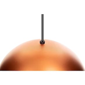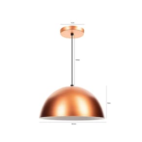 Dimensões: - Cúpula 30,5cm de diâmetro x 15cm de altura x 30,5cm de boca; - Cor Externa: Cobre, Cor Interna: Branco - Canopla Individual com 11cm de diâmetro x 1,5cm de altura. - Cabo PP 100 cm ajustável para menor ; - Feito de Alumínio com Pintura epóxi eletrostática de alta resistência e durabilidade; - Soquete E-27 O mais comum ;