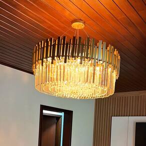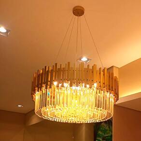 O Pendente de Cristais Transparentes com a Estrutura Dourada. A luminária proporciona design contemporâneo a iluminação com muito brilho.
