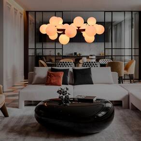 Descrição Material: estrutura em metal e cúpula redonda de vidro Cor: estrutura preto fosco e cúpulas branca leitosa Quantidade de lâmpadas: 25 lâmpadas não inclusas Bocal: g9 em led Medidas: 26 x 70 cm altura x diâmetro Ean: 7898612683451