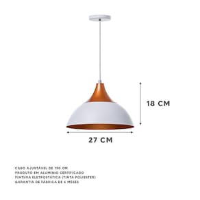 Deixe sua casa muito mais moderna e sofisticada com o Lustre Pendente Panamá Da Ideallume. Produzido em alumínio, o produto não enferruja. O Lustre é ideal para ser utilizado em áreas externas e internas. Com esse produto você dará um toque de beleza que valoriza sua casa. Especificações Técnicas: Marca: Ideallume Modelo: Panamá Produto: Lustre Cor: Branco E Cobre Dimensões: 18x27cm Canopla: redonda de 11cm de diâmetro Material: Alumínio Fio: Ajustável de 150cm Soquete: E-27 utilize a lâmpada que desejar Garantia: Garantia de 6 meses contra defeitos de fabricação IMPORTANTE: Lâmpadas não inclusas neste produto. Conteúdo Da Embalagem: 1x Lustre Pendente Panamá Branco Topo Cobre