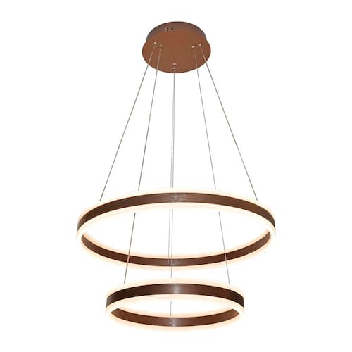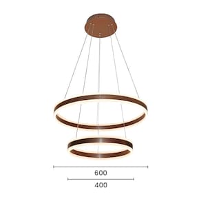 Especificações Gerais do Produto: Voltagem: Bivolt Dimensões AxLxP (mm): De cima para baixo: Círculo 1: 600mm; Círculo 2: 400mm Cor: Marrom Material: Alumínio e Acrílico Garantia: 1 ano junto ao fabricante Referência: DCD03001 Cor Principal: Marrom Fluxo Luminoso: 12600 lúmens Comprimento dos Cabos: Cabo ajustável, máximo 250 cm Potência: 126W Local de Uso: Interno Modelo/Tecnologia: LED Embutido Temperatura da Cor: 3000K - Branco Quente
