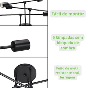 Lustre Teto Moderno Luminária Multidirecional 6 Lâmpadas - Preto