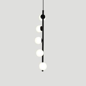 Lustre Vertical Preto - 5 Globos Esfera De Vidro Branco A linha de luminárias modelo tem um ar contemporâneo, um estilo moderno, minimalista e ao mesmo tempo uma sensação retrô. Os pendentes podem ser colocadas em quartos, salas de jantar ou estar e as arandelas indicamos para lounges, salas, dormitórios ou até mesmo em lavabos. Com Design simples trazem classe e estilo a qualquer ambiente. Todos luminárias da linha são produzidas em alumínio com esferas de vidro branco mate. Descrição Técnica: - Modelo: Lustre Pendente com 5 Globos de Vidro - Acabamento: Pintura a pó térmica - Tamanho dos Globos de Vidro: 120mm - Quantidade de Globos de Vidro e soquetes: 5 - Material: Globo em Vidro e Hastes em Alumínio - Tamanho Aproximado (LxAxP) com os Globos de Vidro: 100 cm X 20 cm X 20 cm - Cabo: Cabo Revestido em Tecido - 70cm - Soquete: Padrão G9 - Bivolt: Sim ****