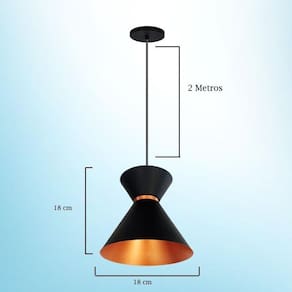 Com medidas aproximadas de 18 cm de altura e 18 cm de diâmetro, esse pendente é compacto e se adapta facilmente a diferentes espaços. A canópla de teto tem 12 cm de diâmetro e o soquete é do tipo e-27 plástico.