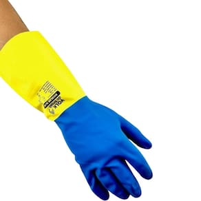 A luva em látex natural com reforço em neoprene oferece proteção química e mecânica, forro flocado em algodão e grip colmeia antiderrapante, garantindo segurança em atividades médias e severas.