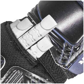 Possui sistema de proteção nos dedos com espinhas removíveis (finger save), que ajudam a evitar lesões sem comprometer a mobilidade. O ajuste é feito com cinta elástica e fecho em fitas aderentes, proporcionando encaixe firme e confortável.