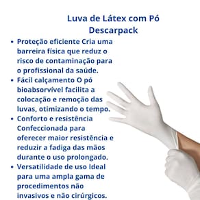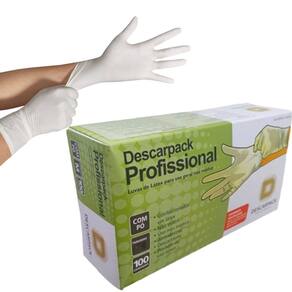 Especificações técnicas Marca: Descarpack. Tipo: Luva para procedimento não cirúrgico. Material: Látex de borracha natural e amido de milho. Características: Com pó bioabsorvível, ambidestra, não estéril, descartável, de uso único. Embalagem: Caixa com 100 unidades.