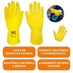 Luva de segurança confeccionada em borracha natural, revestida internamente com flocos de algodão, antiderrapante na face palmar e nos dedos, lisa na face dorsal e punho.