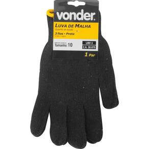 Conteúdo Embalagem:1 Par de luvasDestaques e diferenciais:Confeccionada com 3 fios de algodão, tricotada em uma só peça, com acabamento em overlock e punho com elásticoAplicações e dicas de uso:Indicada para proteção das mãos no manuseio de ferramentas e peças em controle de qualidade, serviços industriais leves e transporte manual de cargas levesCaracterísticas Técnicas:Tamanho da luva: 10 único Número de fios da luva de malha: 3 fios Cor da luva: PretaGarantia: legal: 90 dias Marca: Não Informado