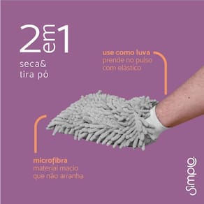 É só vestir a luva na mão e passar seca para tirar pó e secar ou úmida para limpar. Ideal para limpar e secar superfícies lisas, como móveis e eletrônicos, vidros, louças, metais e carros. - Encaixa como luva e prende no punho com elástico - Limpeza com menos esforço, menos água e menos produtos químicos - 100% microfibra - Eletrostática: atrai e retém a poeira - Alta absorção: absorve até 8x o seu peso em água - Durável - Não solta fiapos. É simplo. A microfibra tem fios muito finos 100x mais finos que fio de cabelo . Isso faz com que até as menores sujeiras sejam retiradas por ela. Antes de usar, garanta que a luva esteja limpa - a sujeira pode arranhar objetos. Antes de guardar, lave bem e coloque para secar na sombra.