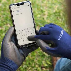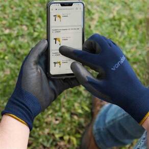 Luva de segurança confeccionada em fibras sintéticas. Possui revestimento da face palmar e ponta dos dedos em poliuretano (PU) com a função touch screen (sensibilidade tátil). Conta com punho com inserções de fibras elásticas e acabamento em overloque.