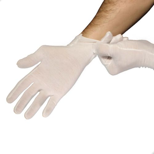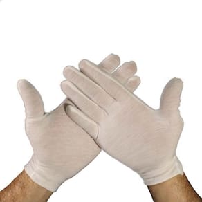 Luva de PanoA luva de pano é de fácil calçamento, veste as duas mãos (ambidestra), é macia, o tecido apresenta um pouco de elasticidade, possui um pouco de textura por conta da costura.O uso de luva é importante para que o manuseio de cédulas, moedas e medalhas seja feita de forma segura, pois evita o contato direto das mãos com as peças.CARACTERÍSTICAS:Cor: BrancaMaterial: panoTamanho: GAcompanha 1 (um) par de luvas de pano Marca: Caravelas coleções