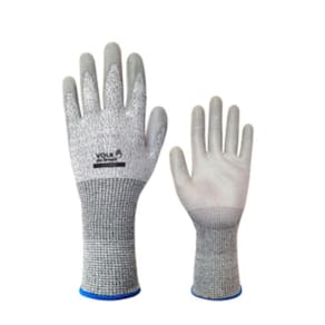 Luva confeccionada em fibras sintéticas hppe polietileno de alta densidade e fibra de vidro, com punho longo e revestimento na face palmar e ponta dos dedos em pu poliuretano .